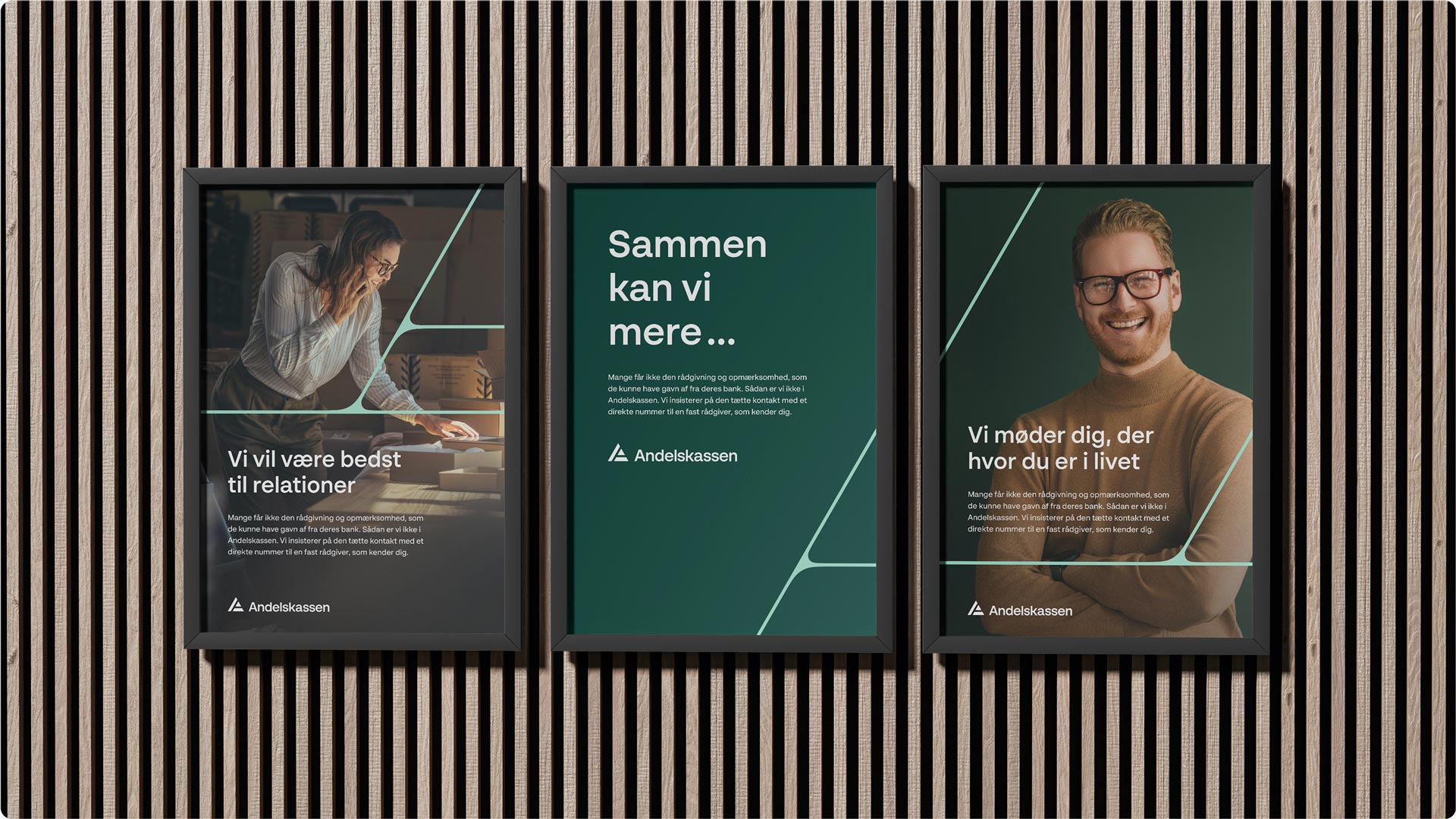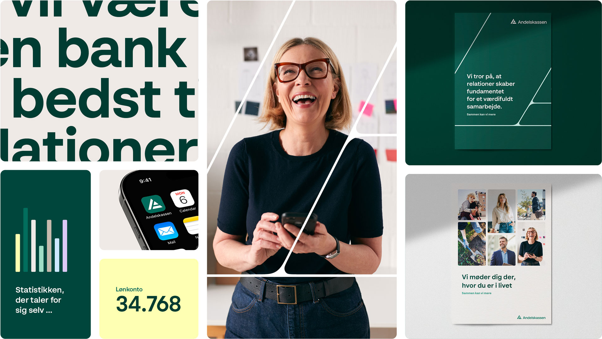 De svar fandt vi sammen med Andelskassen. Resultatet blev en opdateret kernefortælling, en ny brandplatform med en række skarpe hovedbudskaber samt en ny visuel identitet. En identitet, der sikrer genkendelighed i markedet og afspejler alt det, vi har defineret sammen. Det er strategisk vigtigt – dels for at forstå og definere hvem Andelskassen er, men også fordi vi gerne vil påvirke de indtryk, som banken efterlader hos målgrupperne.